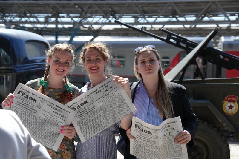 А.А. Паулов: Во-первых, все берут отгулы на работе, чтобы поучаствовать в этой патриотической акции. Во-вторых, у нас в этом году юбилей, пятый юбилейный год паровоза Победы. В-третьих, мы возвращаемся тем маршрутом, как в сорок 1945-м году возвращались наши деды и прадеды, и на окнах наших вагонов размещены фотографии героев, которых их уже нет с нами. Держимся на энтузиазме, на питании РЖД, трехразовом: горячей каше, борще в обед, вечером - крепкий-крепкий чай, безусловно, ну и дружная песня. В вагоне будет присутствовать, баян, гармонь, и даже балалайка с гитарой.