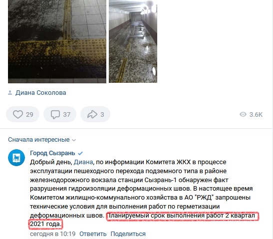В ответ на нарекания автора поста и возмущение подписчиков паблика, представители официального сообщества администрации Сызрани в ВК попробовали успокоить горожан: «По информации Комитета ЖКХ, в процессе эксплуатации пешеходного перехода подземного типа в районе железнодорожного вокзала станции Сызрань-1 обнаружен факт разрушения гидроизоляции деформационных швов. В настоящее время Комитетом жилищно-коммунального хозяйства в АО «РЖД» запрошены технические условия для выполнения работ по герметизации деформационных швов. Планируемый срок выполнения работ - 2 квартал 2021 года».