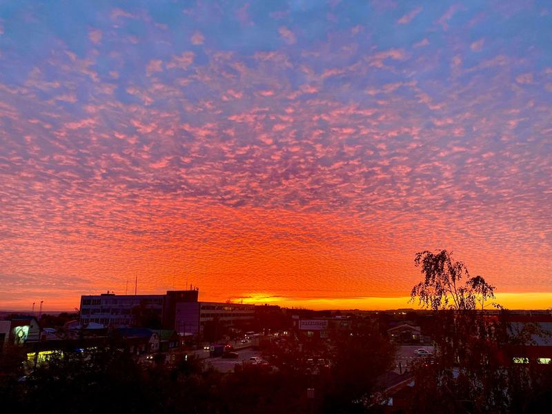 эффект золотисто-алого сияния на небе, на фоне высококучевых облаков.