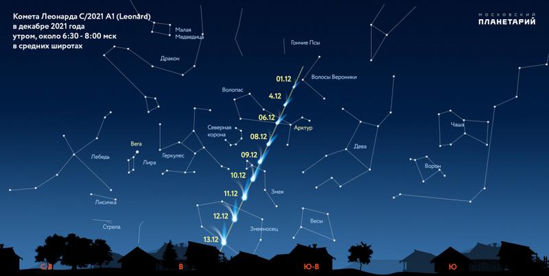 В воскресенье, 12 декабря, у жителей России появится шанс увидеть загадочную и самую яркую в этом году комету Леонарда. Напомним, еще год назад о комете никто не знал: она была открыта 3 января 2021 года. Эта комета лишь один раз пронесется мимо нашей планеты, и потом исчезнет навсегда в глубинах космоса. Напомним, увидеть ее без телескопа сложно - но шанс есть, об этом сообщает сайт московского планетария. 12-13 декабря 2021 комета Леонарда пройдет перигей, подойдя к Земле на минимальное расстояние в 35 млн км. Комета летит сквозь космическое пространство со скоростью около 70 км/сек, и ежедневно ее положение в небе для наблюдателей меняется.