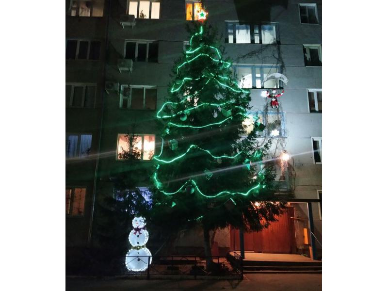 В районе РМЗ семья Агафоновых седьмой год подряд наряжает растущую у подъезда ёлку - закуплены новые сверкающие украшения