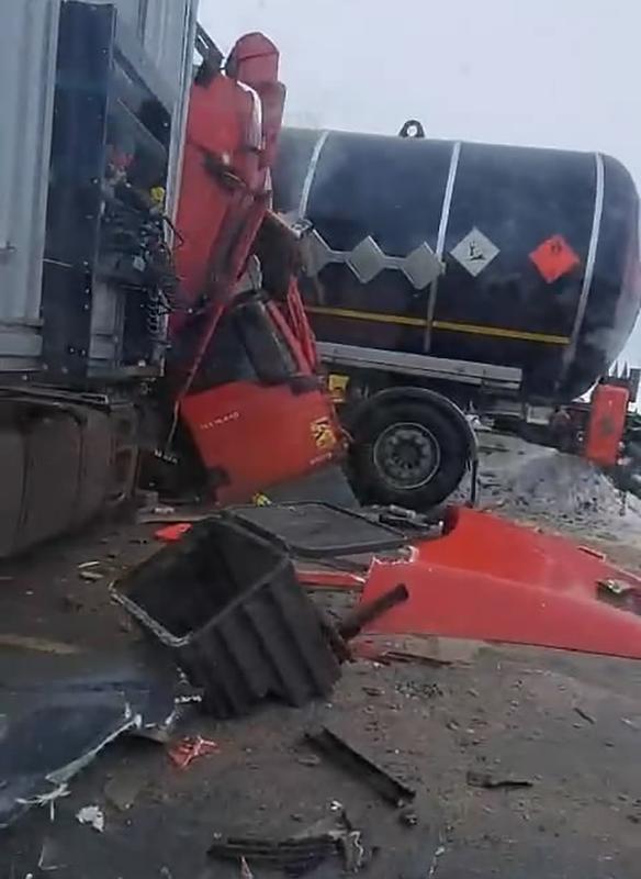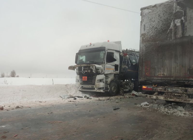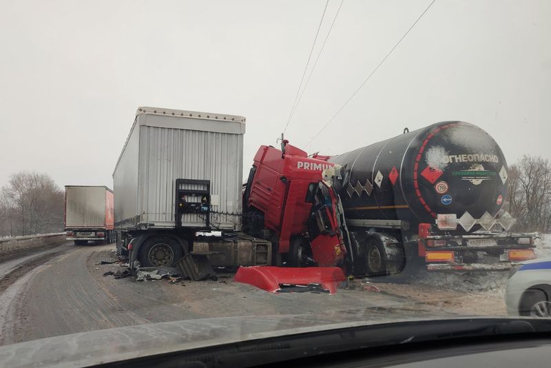Сообщения о пострадавших в этой аварии пока не поступали. Столкнувшиеся грузовики перекрыли проезд, на подъездах к месту аварии растет пробка.