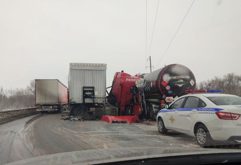 Сегодня под Сызранью на 876 км трассы М-5 произошло столкновение двух большегрузов. Судя по фото с места аварии, за поворотом на Заборовку, если ехать в сторону Москвы, фура MAN выехала на середину проезжей части, где столкнулась с Камазом в составе с полуприцепом цистерной, который ехал навстречу и пытался уйти от удара съехал на заснеженную обочину. В результате ДТП первой фуре сильно разбило кабину, сам тягач развернуло поперек проезжей части. На месте ДТП также на «аварийках» стоит еще одна фура Volvo, которая ехала перед первым MAN и, возможно, также участвовала в ДТП. Все обстоятельства этого ДТП устанавливаются.