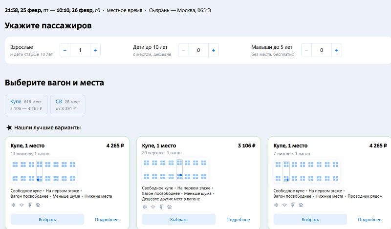 Стоимость билетов из Сызрани в Москву по состоянию на 23 января при покупке через tutu.ru составляет: купе - от 3100 до 4265 рублей, СВ - от 8390 рублей. В обратном направлении, из Москвы в Сызрань: купе - от 2323 до 3146 рублей, СВ - от 7508 рублей.