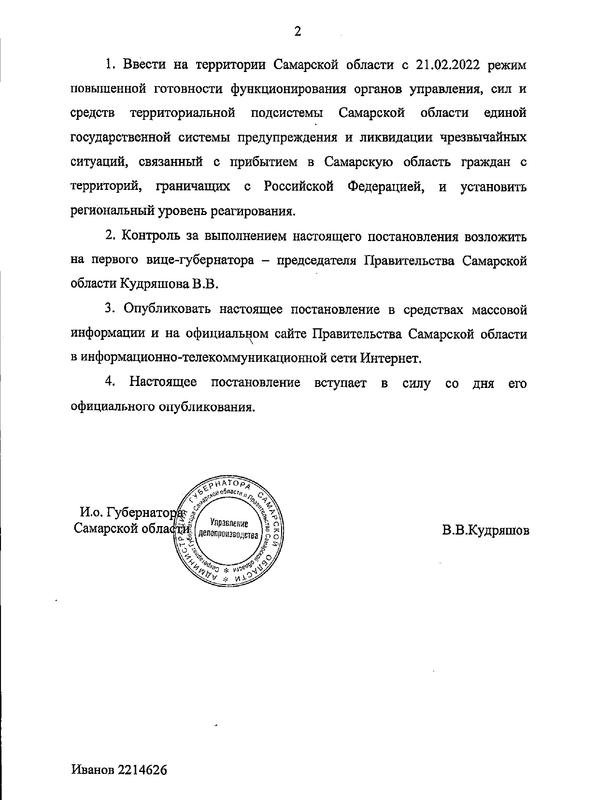 Правительство Самарской области опубликовало постановление о введении режима повышенной готовности функционирования органов управления, сил и средств системы предупреждения и ликвидации чрезвычайных ситуаций. Это связано с прибытием в регион беженцев из Донецкой и Луганской народных республик. Подпись под документом поставил председатель регионального правительства Виктор Кудряшов в качестве и. о. губернатора. В документе сказано о ведении режима с 21 февраля, подписано - 24 февраля, в силу он вступает с момента его опубликования.