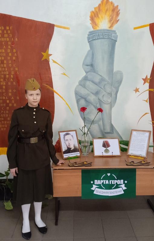 Ксения Шишкина, под руководством педагога Елены Шамро. Парта установлена в особом месте: на стене - склоненные знамена с именами жителей Сызрани, защищавших Сталинград, и здесь же будет теперь находиться и парта бывшего воина Великой Отечественной войны, пожарного Ивана Подлеснова.
