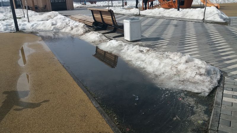 Некоторые игровые площадки в воде, которая не уходит, и скоро, по всей видимости, начнет издавать неприятный запах, так как застаивается. Придется откачивать везде, потому что и погода не помогает - что ни день, то снег. А на завтра синоптики обещают дождь и хмурые бессолнечные дни на ближайшее время.