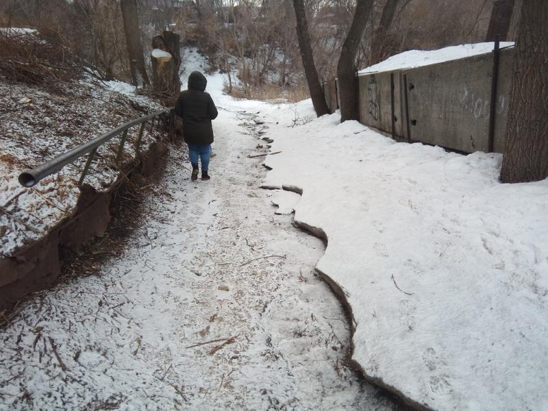 Когда земля внезапно стала оседать, грозя обрушить дома на улицах Загородной и Раменской в овраг, нужно было срочно спасать положение. Несколько лет назад оползень почти вплотную подобрался к домам жителей поселка Западный, обрушив землю на краю оврага, по дну которого протекает безымянная речка. И склон оврага стали укреплять строительным мусором. В те годы как раз сносили расселенные Стандартные дома, строительный мусор вывозили Камазами и сваливали его под заборы сызранцев, чтобы укрепить склон оврага. Склон-то укрепили - а заодно завалили хламом речку, как раз около мостика, по которому дети ежедневно ходят в школу. Дорога с годами стала экстремальной. Речка, русло которой было нарушено, превратилась в болото; весной вода поднимается и заливает мостик, а зимой по обледенелой горбатой насыпи страшно ходить не только школьникам, но и взрослым.