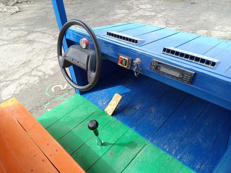 - В автомобиле крутится руль, устроены вместительные лавочки,