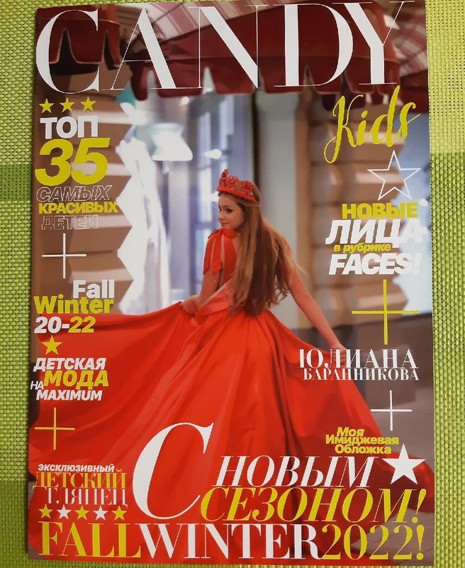 Портрет нашей девушки украсил издание CANDY KIDS - это модный детский журнал PREMIUM класса, на страницах которого публикуют самых красивых и успешных детей. Юлиана попала в ТОП-35, и что самое приятное - именно ее фотография украсила обложку. Ей также посвящена страница внутри журнала.