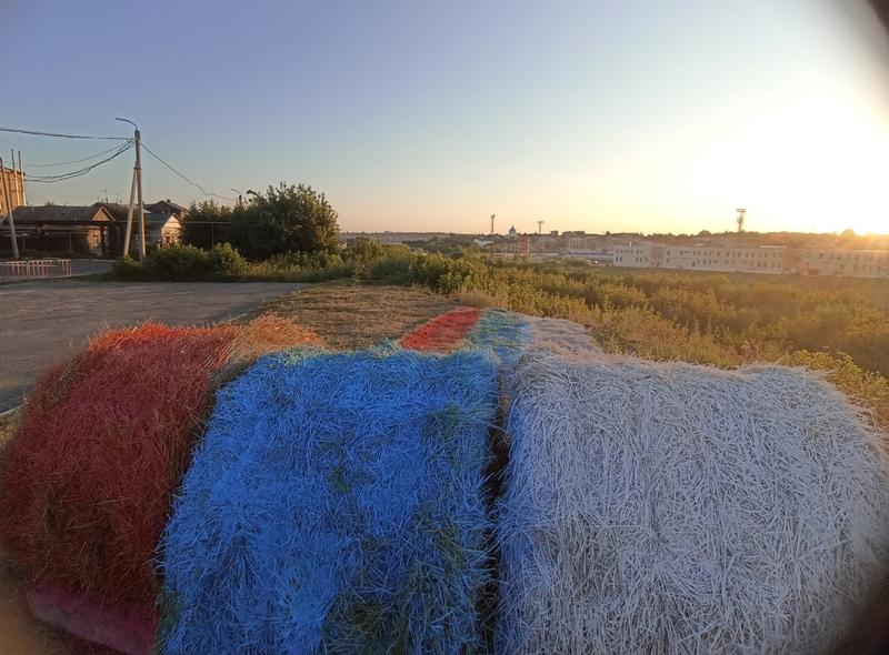 В центре Сызрани появился необычный арт-объект: такого в нашем городе еще не было. На улице Кирова, 30, на площадке перед зданием комитета по строительству и архитектуре, были установлены три больших рулона из соломы - но не простых, а окрашенных в цвета российского триколора. Специальная машина, называемая пресс-подборщик, собирает в полях высушенную солому, после того как комбайн смолотит там хлеб, и прессует цилиндры, которые могут по весу доходить до 260-320 кг. Три цилиндра соломы как бы раскручиваются по земле, оставляя после себя полосы красного, белого и голубого цвета, российского флага. Нужно отметить, что установка цилиндров-триколоров именно в этом году выглядит символично.