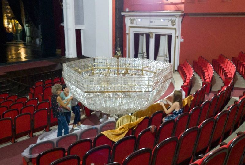 В Сызранском драматическом театре красавицу-люстру, которая восхищает не одно поколение горожан, подготовили к началу нового театрального сезона. Эта давняя красивая традиция настолько важна для учреждения, что ей уделяют особое внимание. Опускают люстру всего один раз в год - главная героиня зрительного зала отнюдь не маленькая. Ее вес составляет 500 килограммов, диаметром 5 метров, высотой 2 метра. На то, чтобы ее опустить и поднять, необходимо порядка 40 минут. Любой, кто хоть раз был в Сызранском драматическом театре им. А.Н. Толстого, остался под впечатлением от этой красавицы, возвышающейся над партером. Когда она гаснет - это невероятно волнующее зрелище.