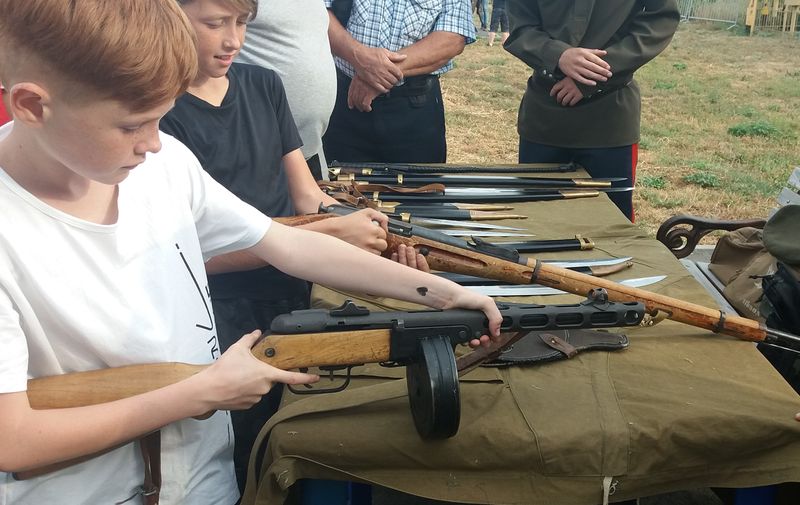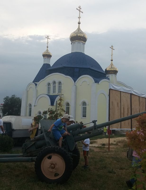 В выставочной зоне собравшиеся могли осмотреть и приобрести изделия местных мастеров, покататься на пони, осмотреть и даже потрогать отдельные образцы представленного оружия. В основном они привлекали мальчишек. Как и площадка, где гости смогли полюбоваться мототехникой - байки понравились всем без исключения. С большой охотой ребятишки исследовали установленное у храма на день праздника тяжелое орудие.