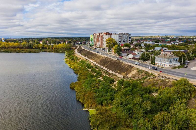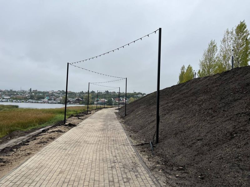 Тендер на благоустройство набережной у монастыря выиграло самарское ООО «Берсо». Проект набережной «На берегу трех рек: продолжение истории» разработан архитектурным бюро «Творческая мастерская» - именно их концепция благоустройства победила на конкурсе малых городов и исторических поселений. На месте болота и поросшего кустарником склона реки выполнено немало из того, что должно быть: проложены дорожки, смонтированы металлические каркасы под амфитеатры, установлены металлические лестницы и декоративное освещение, склон засеян газонной травой, готовятся площадки под арт-объекты.
