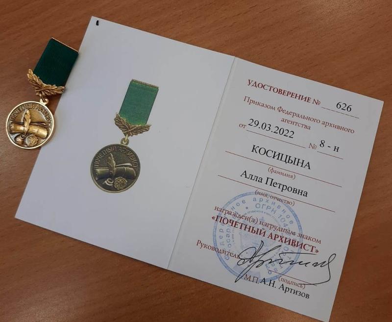Коллеги поздравили директора сызранского филиала Центрального госархива Самарской области Аллу Косицыну с присвоением почетной награды. Алла Петровна была награждена 29 сентября нагрудным знаком Федерального архивного агентства «Почетный архивист». Этот знак присваивается сотрудникам со стажем работы в сфере архивного дела не менее 15 лет (ранее было 10 лет), которые внесли существенный вклад в развитие архивного дела, достигли высоких показателей в работе по обеспечению сохранности, пополнения и использования Архивного фонда Российской Федерации, и, что не менее важно, активно помогали развитию территории. Алла Петровна всю себя посвятила работе, она творчески подходит к ней, делает архивное дело привлекательным для посетителей хранилищ, ведет научную и просветительскую работу.