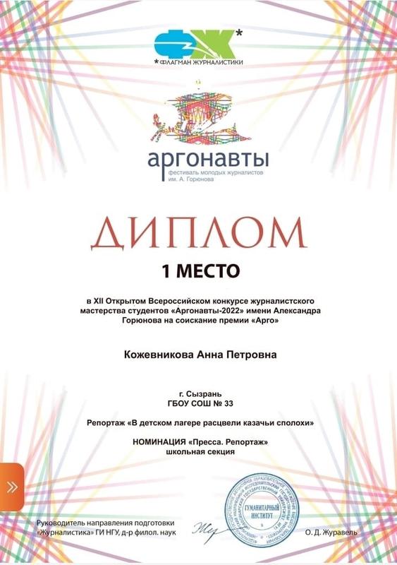 Школьница из Сызрани стала лучшей в России: ученица 7 класса школы №33 Анна Кожевникова стала победителем ХII открытого Всероссийского конкурса журналистского мастерства студентов «Аргонавты» 2022 года имени Александра Горюнова. Девочка победила в номинации «Пресса. Репортаж» (школьная секция). На конкурс поступило 697 заявок. Это стало рекордом, что и отметили организаторы. И, тем не менее, работу молодой сызранки отметили достойно. Анна победила с репортажем «В детском лагере расцвели «Казачьи сполохи». За первое место она была отмечена дипломом. Он подписан доктором филологических наук О.Д. Журавель.