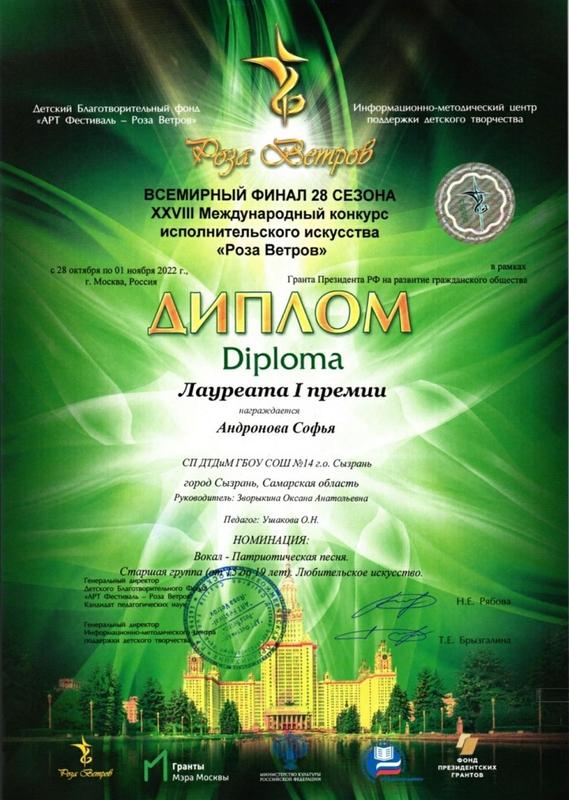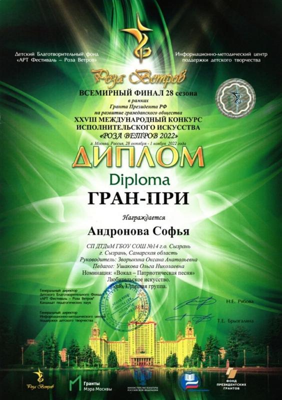 Диплом лучшего педагога 2022 года получила и руководитель Софьи, настоящий профессионал своего дела Оксана Зворыкина. Это уже четвертый Гран-при в 2022 году, ранее Софья Андронова стала обладателем трех Гран-при фестивалей «Солнечный круг», «Роза Ветров» и «ONEFEST».