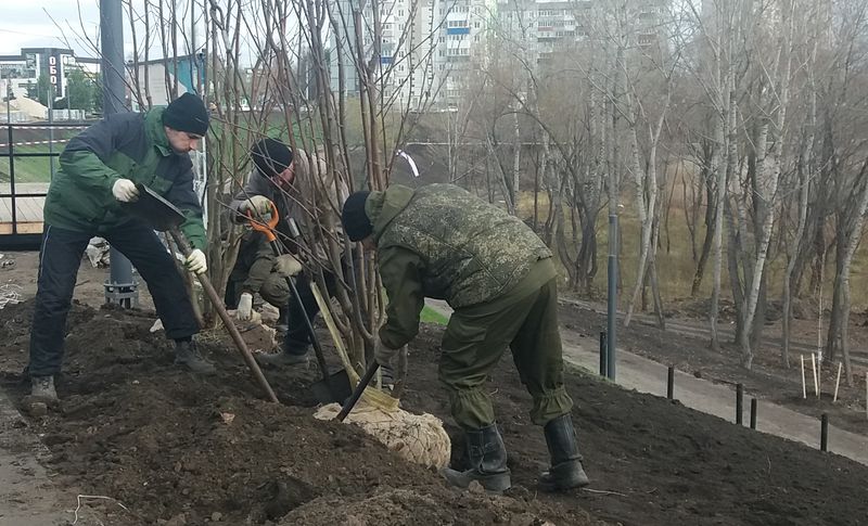 На озеленение территории набережной - только на высадку деревьев и кустарников - ушло около недели, хотя интенсивно работали большой бригадой. Но и высадить надо было немало. Только тополей должно быть 83 единицы. Кроме них - более двух десятков кленов, а еще: лиственницы, сосны, черемуха, рябина, декоративные яблони, можжевельники, бересклеты, ивы «Плакучий гном».