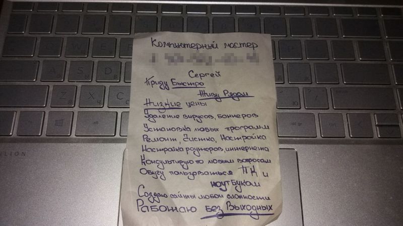 На прошлой неделе многие сызранцы в разных районах города обнаружили в своих почтовый ящиках листовки с предложением, которое их заинтересовало. В них было сказано, что живущий рядом компьютерный мастер быстро по вызову явится, все сделает, цены на его услуги не высокие, а ремонт ему по силам практически без ограничений. К тому же бравый мастер, которого зовут Сергей, создает сайты любой сложности и работает без выходных. При таком наборе сплошных плюсов не хватало только одного - «работаю круглосуточно без выходных». Но и на то, что было им предложено, как оказалось успели купиться многие в городе.