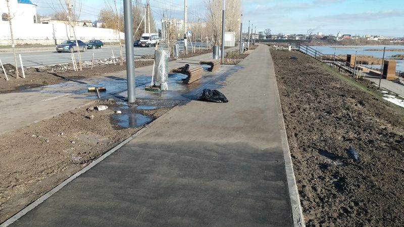 На Монастырской набережной в течение нескольких дней проходит генеральная уборка - тротуарную плитку отмывают в буквальном смысле, асфальтовые дорожки очищают максимально тщательно. Очень затрудняют работу морозы - комья грязи от привезенного грунта для высадки деревьев и после рытья траншеи для возведения подпорной стены счищать не просто, но необходимо. Объект давно пора сдавать, но благоустройство набережной затянулось. Причиной тому можно назвать несколько подрядов, которые были включены в договор по благоустройству позже. Так, подрядчику пришлось обустраивать спуск, который не был предусмотрен проектом, вырубать подросшие кусты на дамбе. Но больше всего задержало работы возведение подпорной стены вдоль пешеходной дорожки внизу склона.