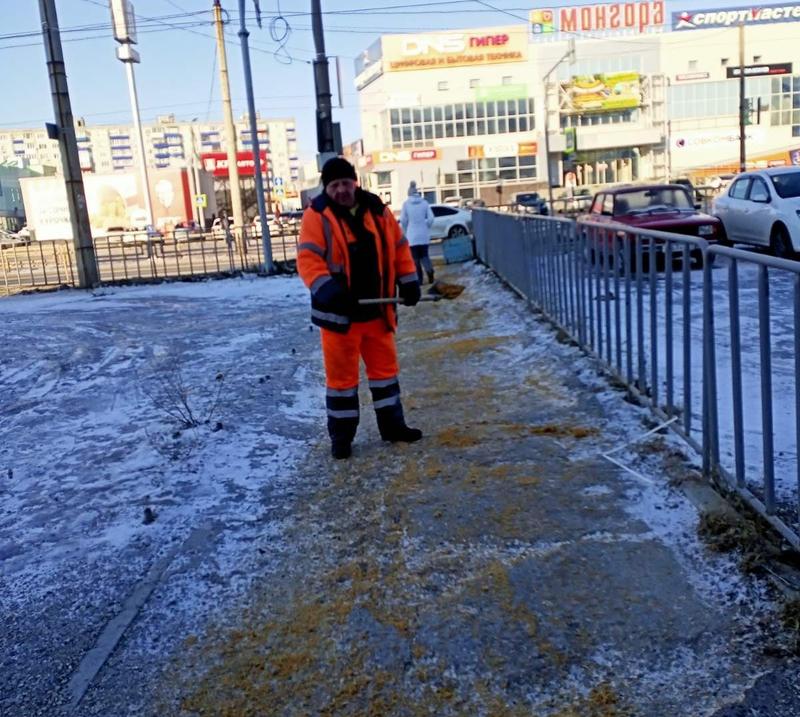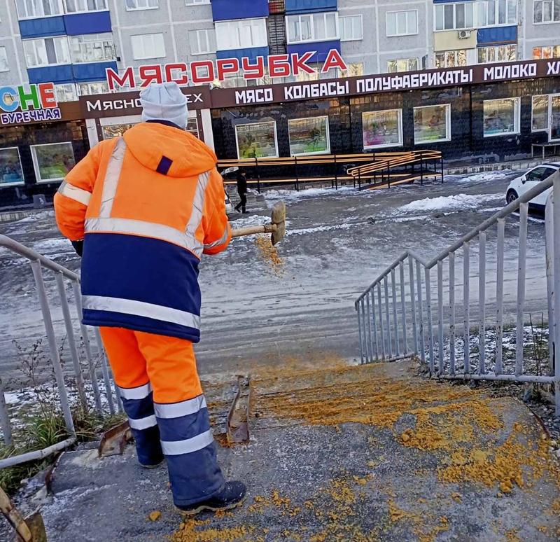 Кроме того, противогололедной смесью обработали тротуары: они вчера превратились в каток, и пешеходы с трудом пробирались по улицам.  Работы прошли на тротуарах по улицам Советская, Интернациональная, в переулках Достоевского, Лодочный, на улицах Степана Разина, Победы, Володарского, на проспектах 50 лет Октября, Гагарина, в районе ГОМ-2, в районе МФЦ (Монгора), улицы Циолковского. Работы продолжаются в настоящее время.