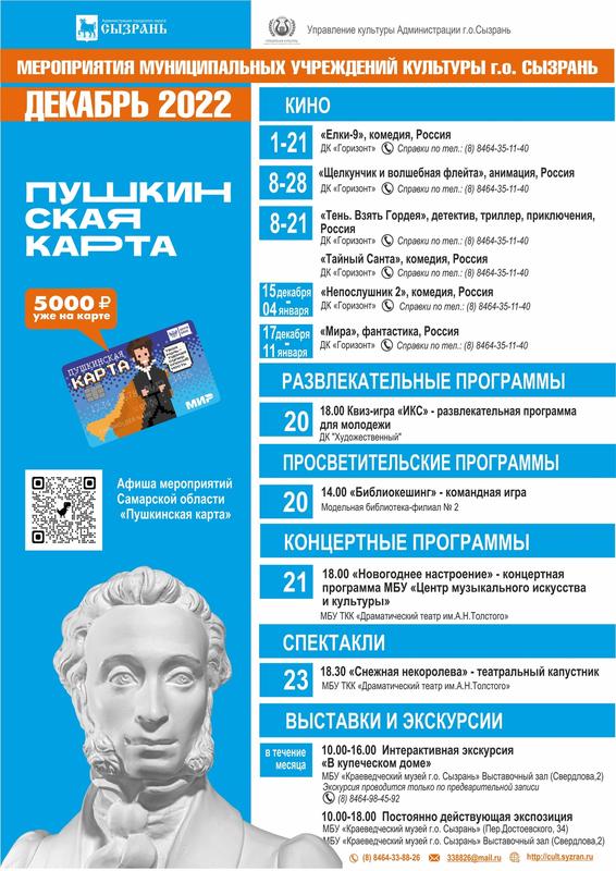 05.01.23, 18:00- театральный капустник «Снежная некоролева» (16+). Билеты на него можно приобрести по Пушкинской карте.