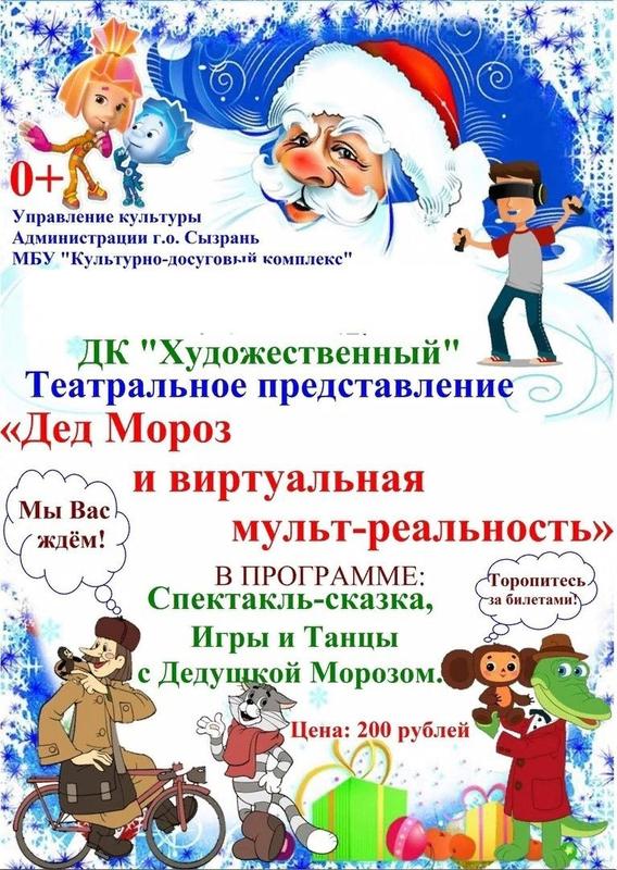ДК «Художественный» 27.12.22 , 16.00 Акция «Спасибо за год» в рамках Всероссийской акции «Новый год в каждый дом». Улица Советская. 29.12.22 , 17.00 «За чашечкой чая» - вечер отдыха для взрослых 03.01.23 , 11.00 Праздничная развлекательная программа «Дед Мороз и виртуальная мультреальность» 04.01.23 , 10:00, 12:00, 14:00 Семейный шоу-спектакль «Волшебные часы Деда мороза» 04.01.23 , 12.00 «Чудеса, да и только» - новогоднее представление для школьников 05.01.23 , 10:00, 12:00, 14:00 Семейный шоу-спектакль «Волшебные часы Деда мороза» 07.01.23