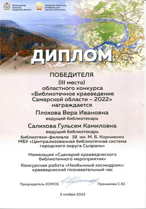 Две сотрудницы «космической» модельной библиотеки-филиала №18 имени Корниенко, библиотекари Вера Плохова и Гульсем Салихова, заняли призовое III место в областном конкурсе «Библиотечное краеведение Самарской области - 2022». Сызранки выступили в роли сценаристов: написанный ими сценарий театрализованного кукольного представления с дополнительным визуальным контентом «держит» зрителя до последней секунды просмотра, причем зритель - самый взыскательный: дети и подростки. А «помогают» им героини - собаки-космонавтки Белка и Стрелка, а также наш земляк-космонавт Михаил Корниенко, известный в Сызрани краевед Елена Мочалова и другие «участники».