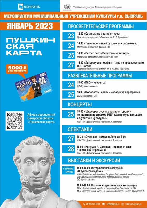 В Сызрани эту неделю можно провести весело, интересно и познавательно: достаточно выбрать, куда пойти, ознакомившись со списком культурных мероприятий на ближайшие дни. С 23 по 28 января в Домах культуры города состоятся развлекательные мероприятия, посвященные Дню российского студенчества. Виртуальный концертный зал Сызрани приглашает на бесплатные видеотрансляции из Московской филармонии. 24 января в 17:30 - Зимний джаз, играет Московский джазовый оркестр под управлением Игоря Бутмана; 28 января в 12:00 Забавный профессор. П.Ершов и его сказка «Конек - горбунок». Ведущий - Павел Любимцев. Играет национальный академический оркестр народных инструментов России имени Н. П. Осипова.