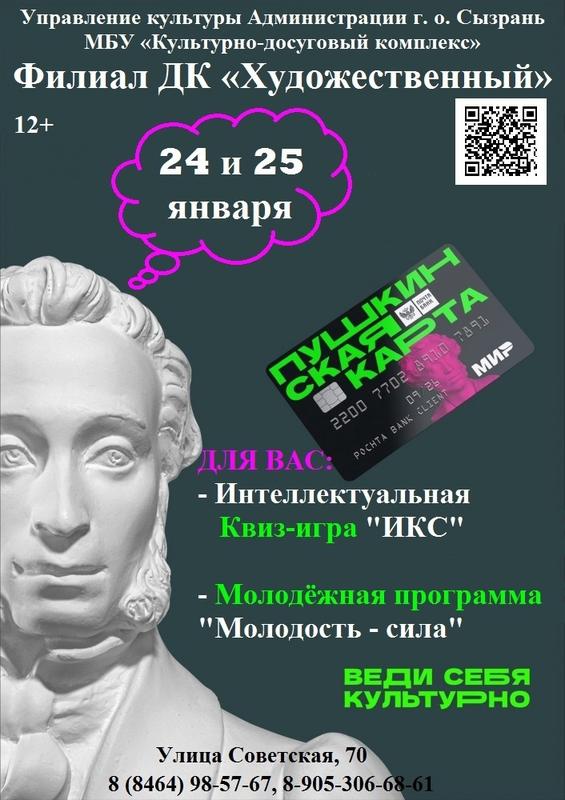 Развлекательные программы: 24 января 18.00 Квиз игра «ИКС» - развлекательная программа для молодежи. ДК «Художественный». 25 января 18.00 Молодёжная программа «Молодость - сила». ДК «Художественный».