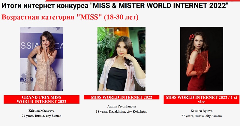 Кристина Мазурова, представлявшая Сызрань на конкурсе красоты Miss World Internet, стала обладательницей Гран-при в своей возрастной категории 18-30 лет. Надо отметить, что это одна из самых сложных категорий, так как в ней представлено наибольшее количество участниц. Девушка работает музыкальным руководителем детского сада №29 Сызрани. Она неоднократно становилась победителем международных и всероссийских конкурсов вокального мастерства. А в мае прошлого года одержала блестящую победу на конкурсе Miss Brilliant в Санкт-Петербурге и была награждена главным титулом Miss Brilliant GRAND PRIX RUSSIA 2022.
