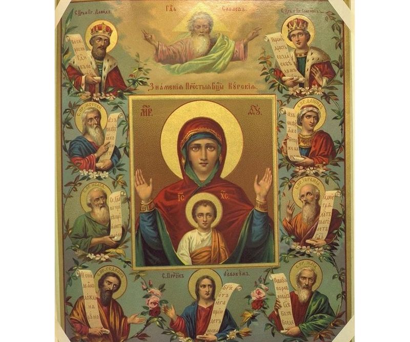 Курская икона Знамение Божией Матери - одна из древнейших икон Русской Церкви. Православные христиане чтут ее сегодня, 21 марта. Икона Божией Матери, именуемая «Знамение», изображает Пресвятую Богородицу, сидящую и молитвенно подъемлющую руки Свои; на груди ее, на фоне круглого щита (или сферы) благословляющий Божественный Младенец — Спас-Эммануил. Такое изображение Богоматери относится к числу самых первых Ее иконописных образов. Иконы Божией Матери, известные под именем «Знамение» появились на Руси в ХI-ХII веках, а называться так стали после чудесного знамения от Новгородской иконы, случившегося в 1170 году.