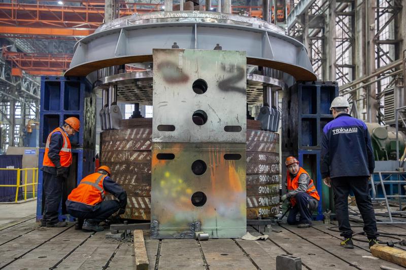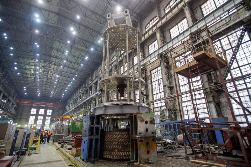 На заводе это необычное изделие успели окрестить гигантской мантышницей. Речь идет о платформе для транспортировки блока защитных труб, которая скоро будет установлена в шахте ревизии первого энергоблока АЭС «Аккую» в Турции. Конструкция состоит из соединенных шестью стойками четырех плит с множеством отверстий и полностью оправдывает народное прозвище. Сегодня это изделие девятиметровой высоты находится в цехе № 5 и проходит испытания, в том числе на прочность с помощью груза весом 125 тонн. Как рассказали на заводе, платформа является составным элементом оборудования шахты ревизии. Изделие будет использоваться для извлечения блока защитных труб из реактора, его транспортировки в шахту ревизии и последующей установки обратно в реактор в ходе установки, эксплуатации или процесса загрузки свежего топлива.