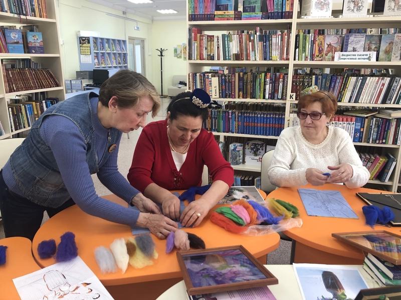 К слову, сирени, о которой был сложен романс композитора, был посвящен мастер-класс по живописи шерстью мастерицы Марины Вершининой. Мастер-класс планировался 1 апреля, в день открытия выставки, но, как рассказала Марина Алексеевна, в этот день произошло неприятное происшествие: неизвестный шутник «заминировал» библиотеку. Поэтому часть первоапрельских мероприятий, в том числе и мастер-класс, пришлось перенести на несколько дней. Участники мастер-класса с удовольствием и немалым удивлением - все получилось, а казалось так сложно! - сделали ветку сирени из наслоения шерстяных волокон, под стекло. Как рассказала Марина Алексеевна, она увлеклась этим необычным видом творчества с 2015 года, и с тех пор на мастер-классах обучает этому творчеству горожан.