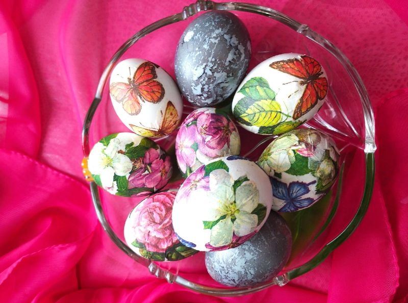 Также широко используется способ нанесения на яйца рисунка из обычной бумажной салфетки. Очень красиво, красители вообще не нужны - варятся яйца в обычной воде, а затем на них наносятся рисунки. Необходимо только аккуратно отделить сам рисунок или орнамент от салфетки и правильно его закрепить на яйце.