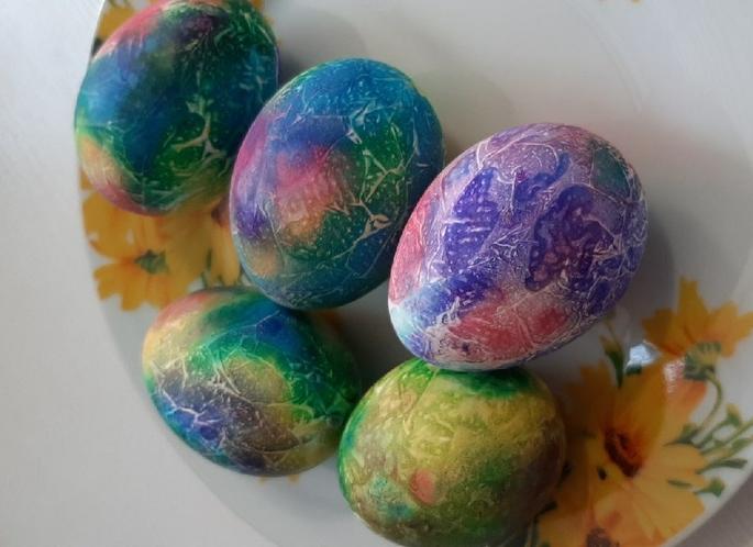 Еще один очень распространенный способ, связанный с своего рода творчеством - красить яйца сразу несколькими цветами из набора с красителями. В этом случае используется бумажная салфетка, в которую заворачивают уже сваренные просушенные яйца, и на салфетку пипеткой или чайной ложкой наносятся уже приготовленные разные красители.