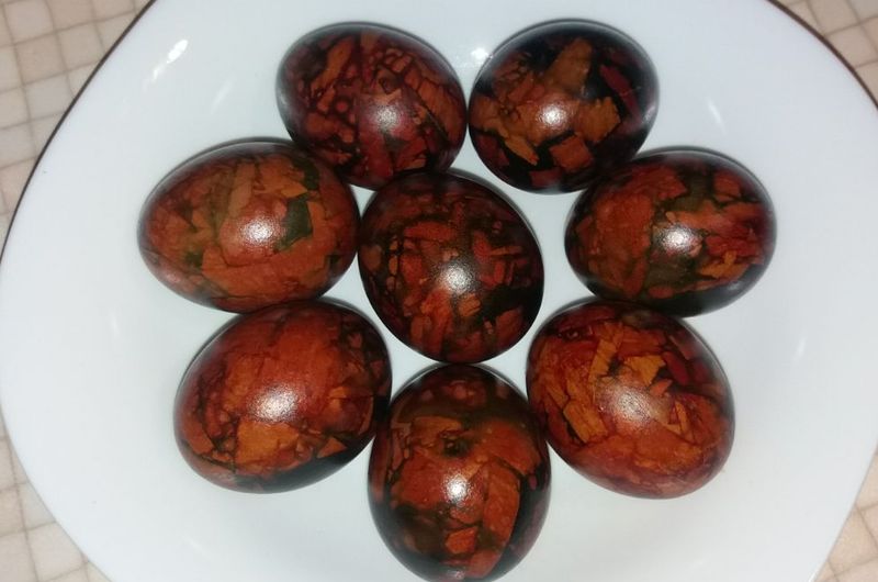 Еще один, набирающий популярность способ, делает яйца похожими на мраморные. Для этого необходимо порезать ножницами сухую луковую шелуху, налепить ее произвольно на мокрое сырое яйцо, обмотать марлей или капроном, плотно закрепить концы нитками и варить в обычной воде 10 минут. Затем в воду добавить зеленку и варить еще 10 минут. Достать яйца, снять с них марлю вместе с шелухой, промыть яйца и уникальный рисунок готов.