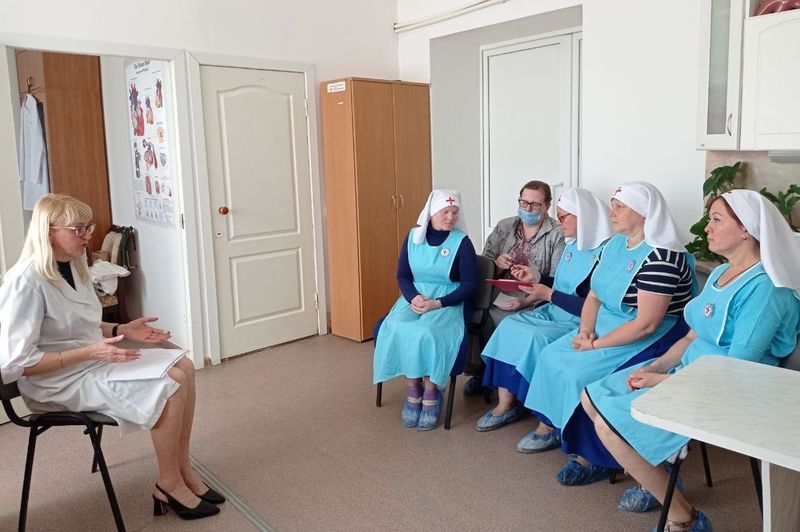 Во вторник, 30 мая, в соответствии с соглашением между больницей и Сызранской епархией, заместитель главного врача по медицинской профилактике Сызранской ЦГРБ, руководитель центра здоровья Марина Завьялова проводила обучение сестер милосердия Сретенской общины милосердия во имя Преподобномученицы великой княгини Елизаветы основам профилактики хронических неинфекционных заболеваний, особенностям течения заболеваний в пожилом и старческом возрасте. Обучение проводилось на базе отделения паллиативной медицинской помощи №2, расположенного в поселке Новокашпирский.