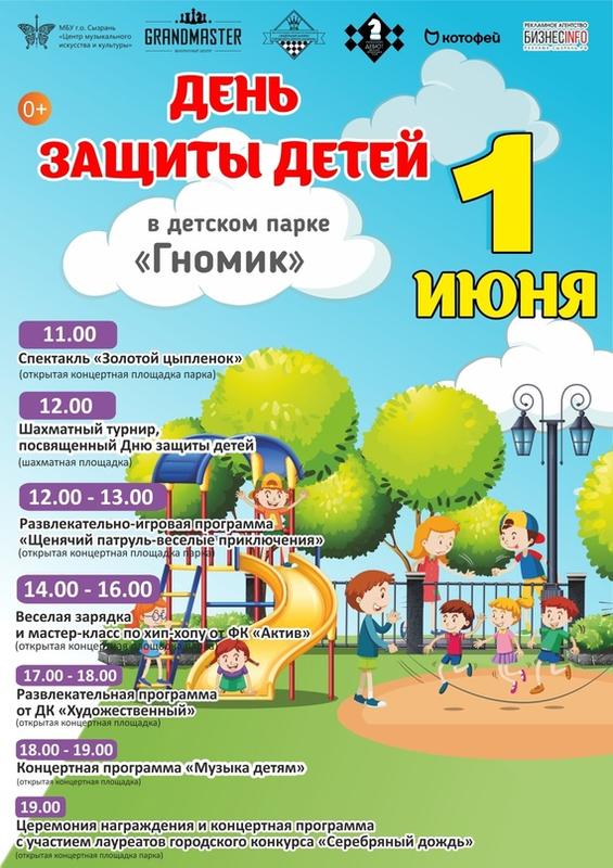 Красочно в Сызрани намерены встретить День защиты детей: в подготовке праздника примут участие и муниципальные организации, и предприниматели, и общественники, и духовенство города. Большая программа запланирована в парке «Гномик»: она стартует в 11 часов спектаклем «Золотой цыпленок»; затем, в 12 часов, в детском парке пройдет шахматный турнир, в то же время на открытой концертной площадке детей будет развлекать Щенячий патруль; с 14 до 16 часов ФК «Актив» проведет в «Гномике» веселую зарядку и мастер-класс по хип-хопу; в 17 часов на сцену выйдут артисты ДК «Художественный»; в 18 часов начнется концертная программа, а в 19 часов - выступят участники городского конкурса «Серебряный дождь». В сызранском театре в этот день пройдут веселые конкурсы с артистами и спектакль «Невеста для царевича».