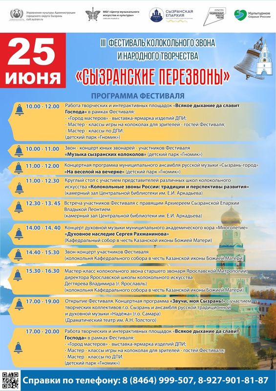 В ближайшее воскресенье, 25 июня, в Сызрани пройдет III-й Фестиваль колокольного звона и народного творчества «Сызранские перезвоны». Мероприятия приурочены к празднованию явления чудотворной иконы Феодоровской Божией Матери – покровительницы города Сызрань. В программе фестиваля: концерты духовной и фольклорной музыки, звон-концерты, мастер-классы игры на колоколах ведущих мастеров колокольного звона и мастеров декоративно-прикладного творчества, работа интерактивных площадок, выставка изделий прикладного творчества. Кроме того, будут организованы мастер-класс игры на колоколах «Особенности музыки колоколов в разных регионах России» и круглый стол с участием представителей различных школ колокольного искусства «Колокольные звоны Поволжья в палитре музыкальной культуры России».