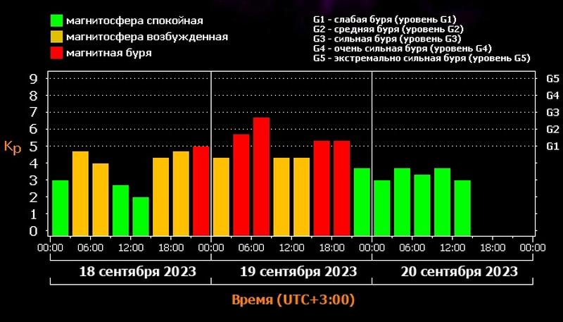 Прогноз на магнитную бурю 19 сентября подтвердился, причем событие оказалось заметно сильнее ожидавшегося. Первые возмущения магнитного поля были зарегистрированы еще днём ранее, в понедельник, а максимальные индексы 19 сентября достигли значений Kp=6,67 (при максимуме 9). «Сейчас магнитное поле Земли стабилизировалось. Ближайшие дни, как минимум до выходных, геомагнитные индексы должны остаться в зеленой зоне. При этом возможен рост вспышечной активности, но даже в случае сильных вспышек они не смогут оказать влияние на Землю до конца недели. В целом, высокая мощность бури стала довольно неожиданной», - отметили в Лаборатории Солнца и рассказали о непроверенных пока сообщениях о полярных сияниях.