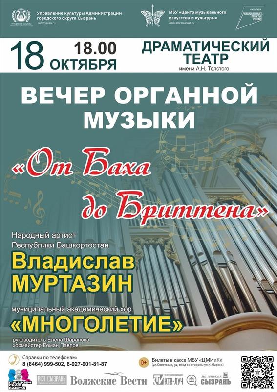Центр музыкального искусства и культуры» организует для сызранцев концерты в рамках культурно-просветительского проекта «Встречи на Волге». 18 октября в 18:00 в концертном зале сызранского драмтеатра пройдет вечер органной музыки «От Баха до Бриттена». В Сызрани выступит народный артист республики Башкортостан Владислав Муртазин и муниципальный академический хор «Многолетие» под управлением Елены Шараповой. В исполнении музыкантов прозвучит музыка разных эпох, в том числе хоровые шедевры Иоганна Себастьяна Баха, Джованни Баттиста Перголези и Бенджамина Бриттена. Благодаря уникальным возможностям мобильного цифрового органа «Hauptwerk» вместе с исполнением музыки разных стран и эпох, его звучание будет меняться, так как в памяти инструмента хранятся голоса труб конкретных исторических органов, находящихся в разных странах Европы.