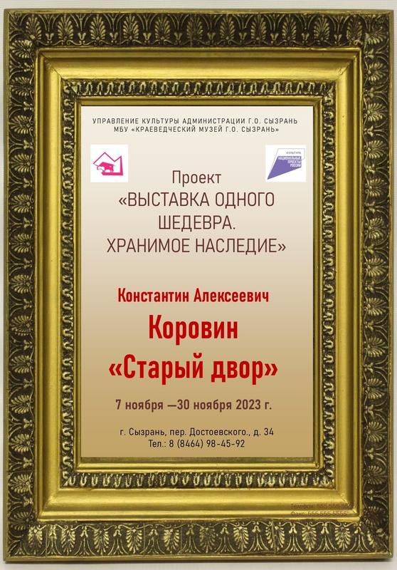 Две выставки в Краеведческом музее Сызрани привлекают в последние дни внимание горожан. Сызранский музей реализует проект «Выставка одного шедевра. Хранимое наследие» и демонстрирует ценные экспонаты, картины известных художников, которые когда-то выставлялись, а затем были убраны на хранение. В этот раз демонстрируется этюд Константина Алексеевича Коровина «Старый двор», написанный им в 1890 году. Русский живописец родился в XIX веке, прожил длинную жизнь, написал множество известных полотен и умер в Париже в 1939 году. Он увлекался импрессионизмом и символизмом, в своем творчестве часто шел против принятых норм и не боялся быть смешным.
