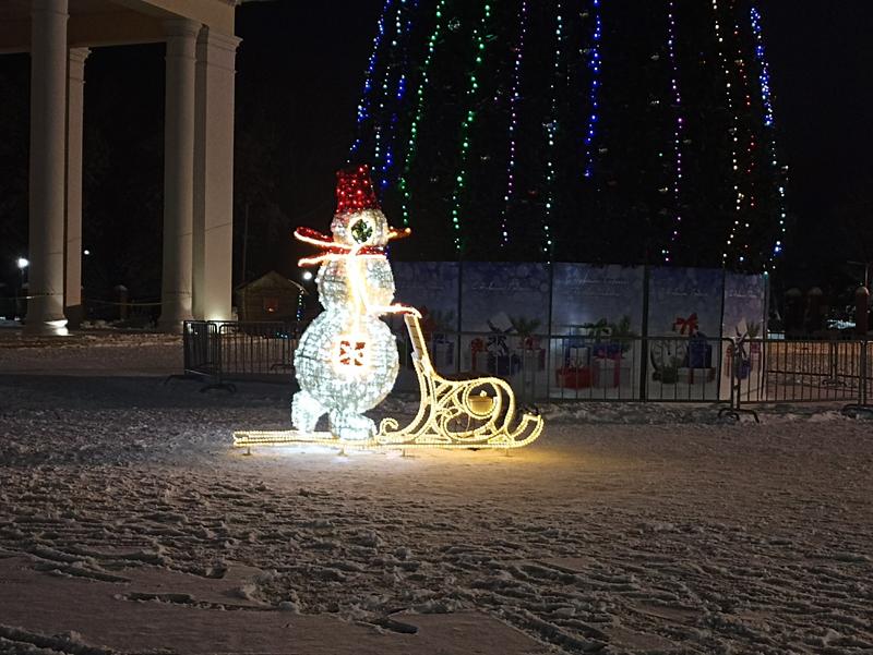 Зато на площадь Ленина прибыл сверкающий Снеговик-почтовик. Продолжается также новогоднее оформление Кузнецкого парка: на входе установлена горящая новогодними огнями арка.
