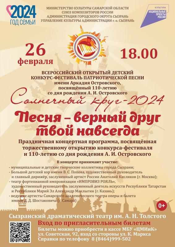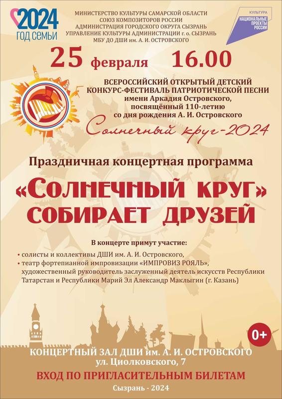 Через две недели, 25 февраля в Сызрани стартует ежегодный Всероссийский открытый детский конкурс–фестиваль патриотической песни имени Аркадия Островского «Солнечный круг». Он пройдет до 28 февраля. Конкурс–фестиваль традиционно проводится в нашем городе в конце зимы. Ведь 25 февраля 1914 года в Сызрани родился один из самых талантливых советских композиторов-песенников: Аркадий Ильич Островский. В детской школе искусств, носящей его имя «Солнечный круг» собирает способные детские коллективы, солистов, а также юных художников из разных регионов России. Чем удивит «Солнечный круг» на этот раз? В 2024 году масштабное музыкальное событие открывает целый комплекс культурно-творческих мероприятий, посвященных юбилейной дате – 110-летию со дня рождения Аркадия Островского. «Вход - по пригласительным билетам», - указано в афишах.