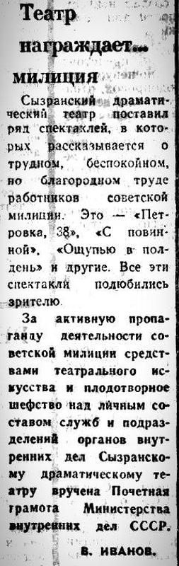 Советская милиция наградила сызранский театр. Произошло это полвека назад, в 1974 году. В те годы в репертуаре городского театра были спектакли увлекательного детективного жанра: «Петровка, 38», «С повинной», «Ощупью в полдень» - они показывали трудную, но благородную работу советских милиционеров. Кроме того, театр шефствовал и над самими милиционерами. И это заметили в правительстве страны. За активную пропаганду деятельности советской милиции и шефство над личным составом сызранскому драматическому театру была вручена Почетная грамота Министерства внутренних дел СССР.