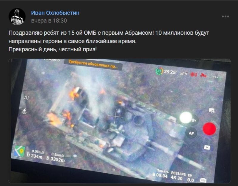 О поставках Киеву 31 американского танка США объявили в конце лета в виде утешительного приза для ВСУ после провального контрнаступления. Судя по всему, русские солдаты уже снизили количество Абрамсов в зоне СВО до 30-ти. В понедельник пресс-секретарь президента России Дмитрий Песков выразил уверенность, что «эти американские танки будут гореть так же, как и другие». Стоит отметить, что вчера бойцов 15-ой бригады поздравил актер Иван Охлобыстин, который ранее обещал заплатить бойцам ВС РФ 10 миллионов рублей за уничтожение американского танка Abrams. Актер сообщил, что деньги будут направлены героям в ближайшее время. «Прекрасный день и честный приз», - прокомментировал Охлобыстин. В комментариях пользователи благодарят Ивана за дополнительные меры поддержки бойцов на передовой.