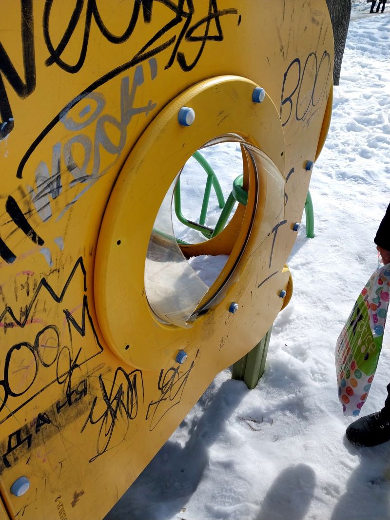 Причиной публикации в социальной сети стал разбитый иллюминатор корабля на детской площадке, которая была благоустроена в районе Военного городка несколько лет назад. На фотографиях помимо разбитого окна хорошо видно отношение детей к малым архитектурным формам, о которых дети многих других городских дворов пока только мечтают. Исписанный маркерами, школьными замазками, баллонами с красками корабль будто выплыл из худших гетто-кварталов, про которые американцы любят снимать фильмы. Рядом разве только не хватает бочки с чем-то дымящемся внутри. Такое положение дел, конечно, не устраивает местных жителей. Сызранцы переживают не только за дворовое имущество, но и за будущее поколение, которое по мнению жителей района «совершенно оторвано от жизни и ничего не ценят».