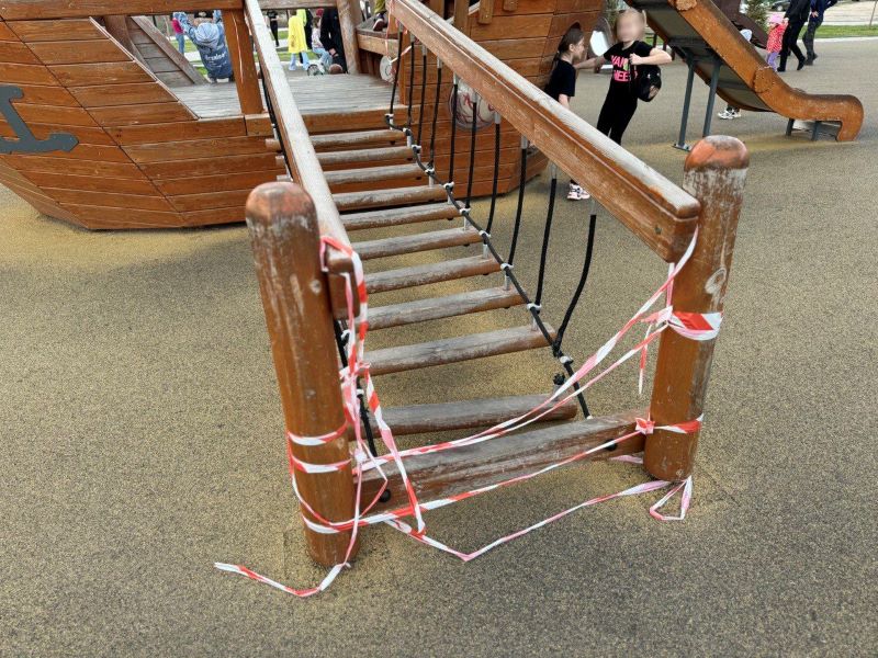 Ежедневная беспощадная эксплуатация дает о себе знать. Подкручивать и укреплять деревянные конструкции нужно постоянно, а если этого не делать, то выходит так, что элементы просто ломаются. Винить детей в разрушениях нельзя, а вот напомнить о бережном отношении, внимательности стоит. Как и стоит спросить у служб за содержание набережной.