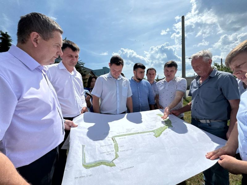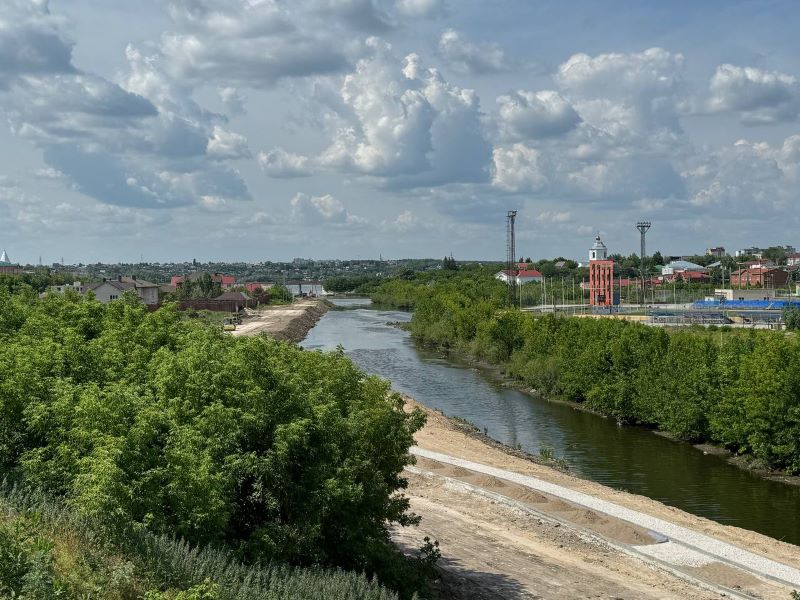 На данный момент освобождены от аварийных деревьев и поросли участок будущей набережной. Расчистка продолжается. Рабочие на объекте заняты укладкой бордюрного камня под пешеходные и велодорожки.
